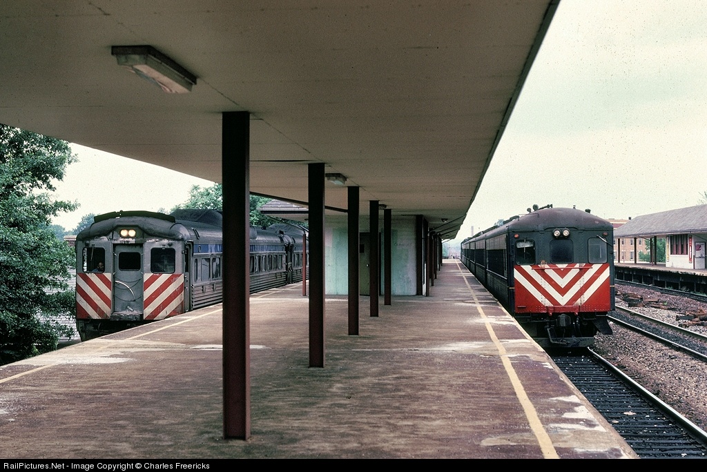 On the left is the Scoot to Bayonne, lead by RDC1 #553, a 1954 Budd. On the right, is a Raritan bound train. Its cab car was one of four that were fabricated our of steel coaches in CNJ’s Elizabethport Shops in 1966 for the Aldene Plan. These push-pull cab cars were rebuilt out of 1927 era 1300 series round roof commuter coaches, originally built by American Car & Foundry. When built, the round roof coaches were convertable into electric MU cars for an anticipated CNJ electrification that never happened.