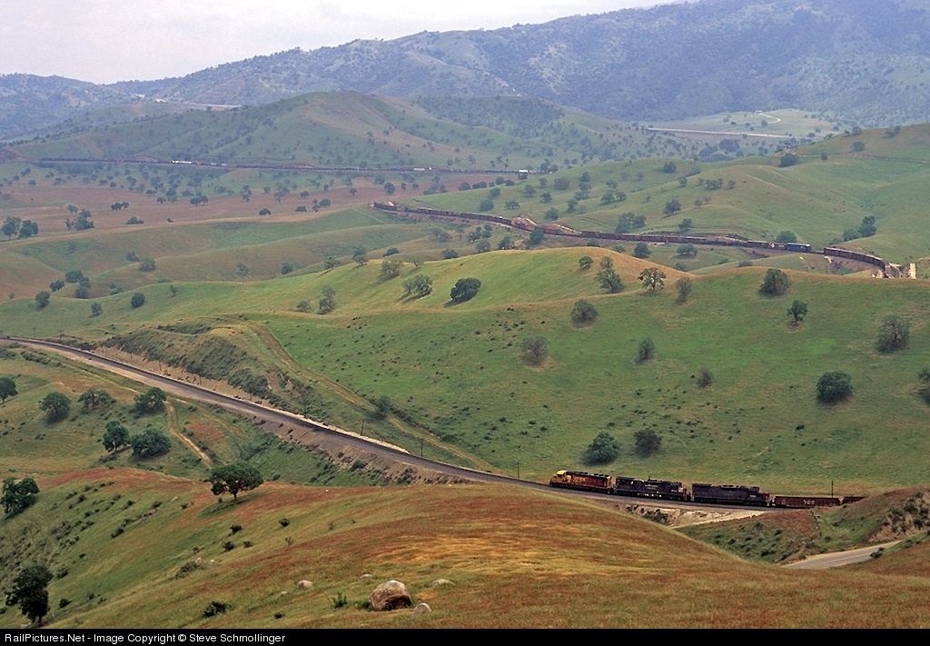 From atop one of Tehachapi Pass' very steep hills, we see a westbound SP manifest drop down from tunnel 2 as an eastbound freight in the distance makes its way out of Allard Horseshoe.