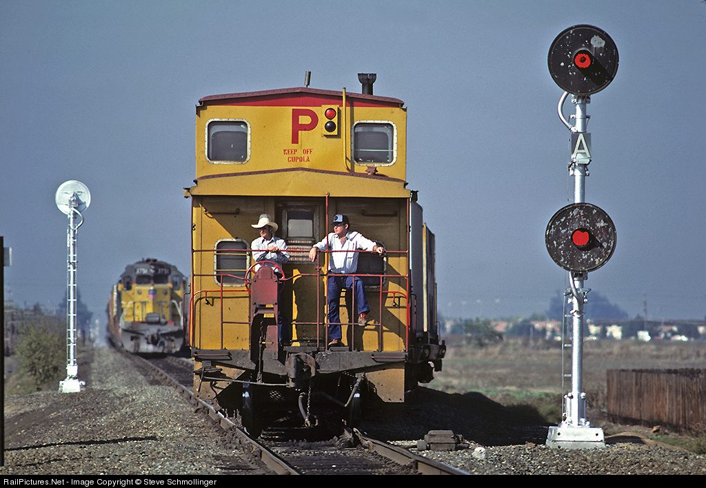The conductor and rear brakeman appear to be distracted by something to the left of the camera as their "pool" caboose enters the siding with a westbound waiting on the main.