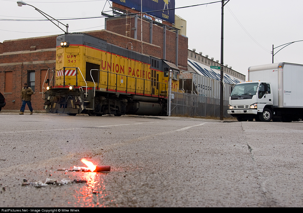 | The UP North Yard switcher switches out Morton Salt, which involves a short stretch of street running. A road flare has been set out to warn motorists on busy Elston Ave. |