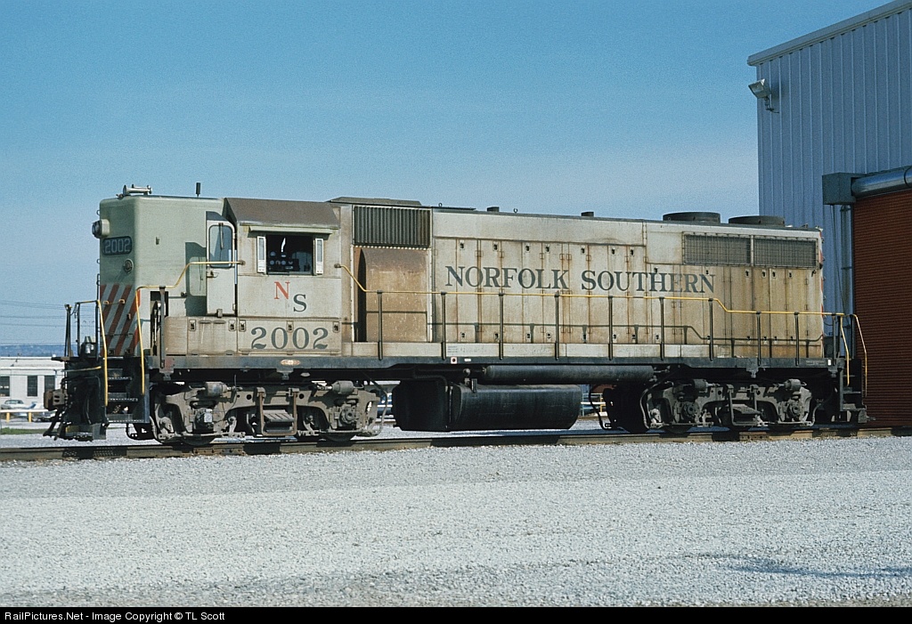 Former Norfolk Southern GP38 with a high-short hood seen at Southern's paint shop in Chattanooga after the 1974 take over of the "old NS". The original low-short hood has been "raised" and the unit has been reconfigured for long hood forward operation (the control stand can be seen on what once was the conductor's side) by Southern's Pegram Shop in Atlanta. The ex-NS GP38s never received dynamic brakes, however, some of them were equipped with larger fuel tanks later in their careers.