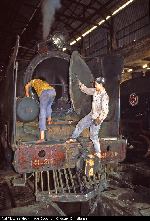 Working conditions while cleaning a smokebox were primitive in the shed of Hanoi in northern Vietnam. Engine 141-210 was built in 1968 by Tangshan Works, China.