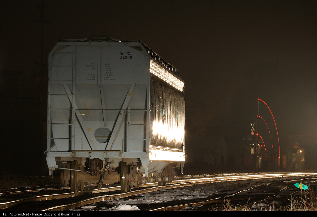 | Marquette Rail's 3001 illuminates the side of a lonely hopper as it comes around a curve in the middle of some late-night switching. This time exposure both captured the lowering of the gates at Gardner street as well as the subtle lighting from my car's headlights. |