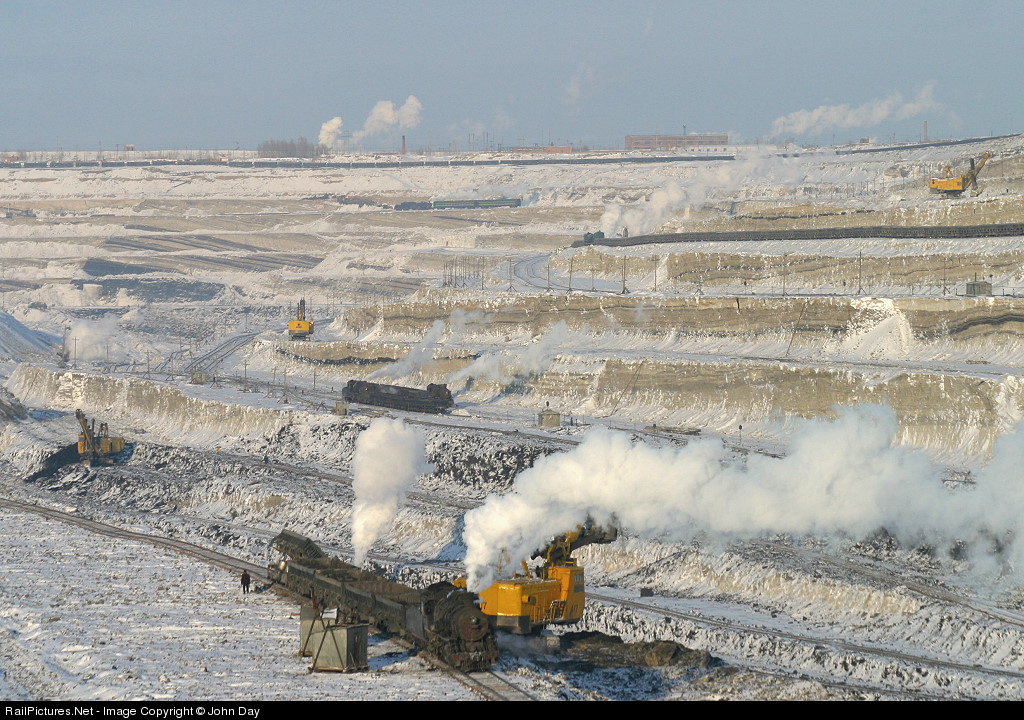 Five steam locos, including one on a short pasenger train descending into the pit from the surface, and four electric shovels, are visible in this panorama of the huge open cast mine at Jalainur.