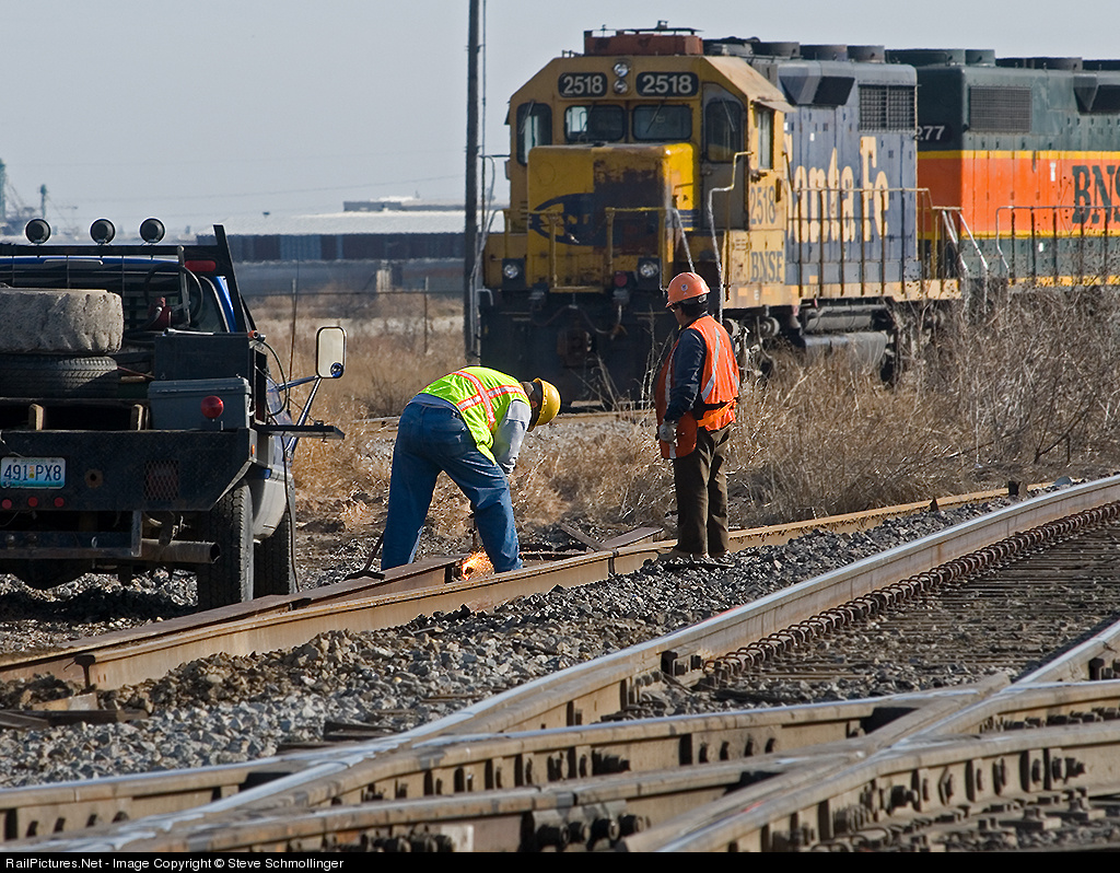 A couple of workers cut rail for a spur that comes of the Fort Worth Sub main line.