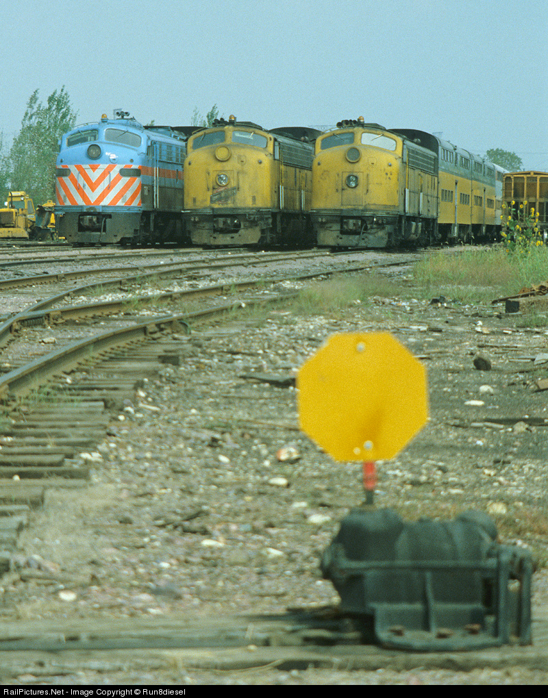 On a hazy late summer afternoon, three commuter E units swap stories while parked in the Des Plaines coach yard on their weekend layover. No doubt, the CNW units are asking the newly-repainted RTA unit alot of questions!