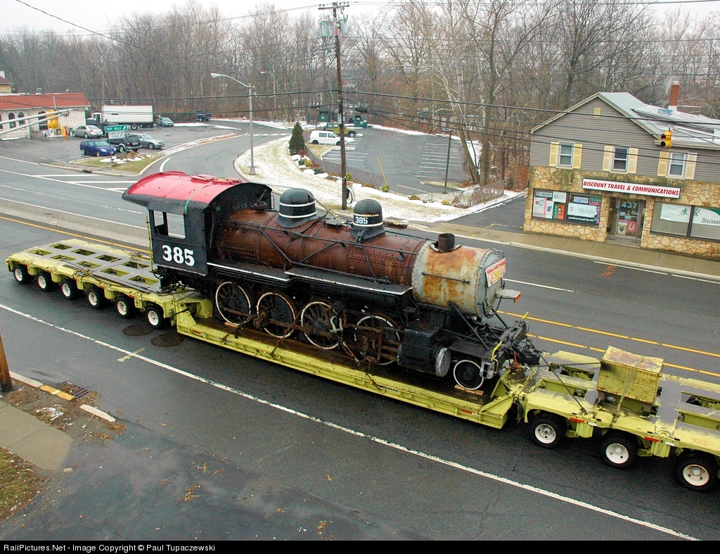 | ON ITS WAY HOME... Former Morris County Central 2-8-0 #385 rides on an 80-wheel lowboy trailer to its eventual destination, the Whippany Railway Museum. Thanks to the Whippany Fire Department for allowing me to go on their roof to get this unique elevated view! |