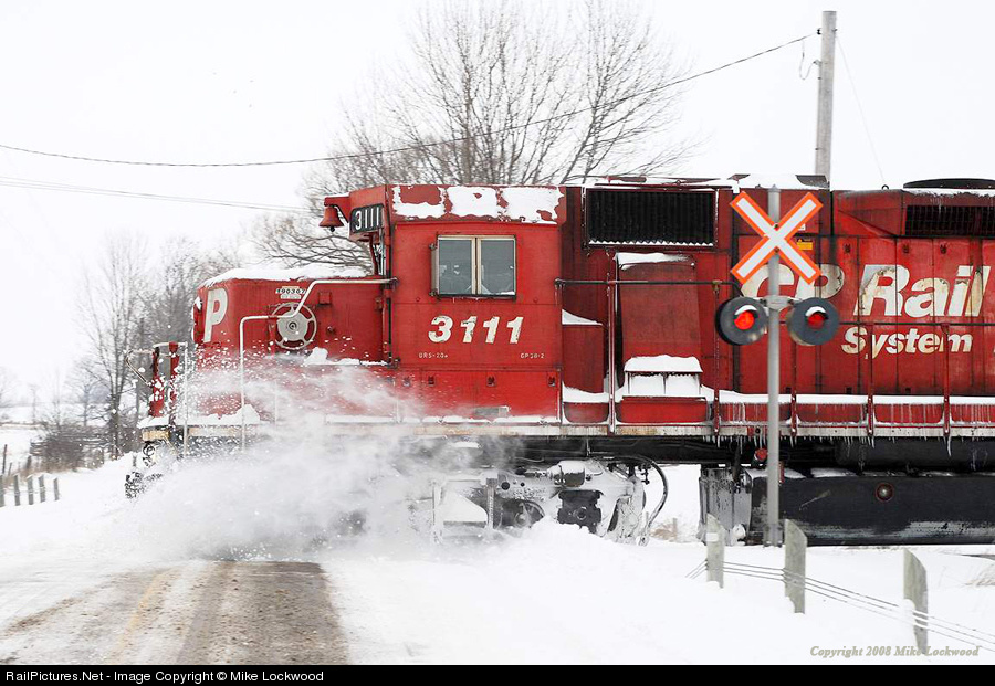 The first train through since the snowfall, CP 3111 takes care of the snowbank left behind by the Municipality. This scene has been repeated many times this morning, and 3111 shows clear signs of these encounters, especially on the front truck. CP 1271, 8219, 8220, and 3114 trail. 1024hrs.