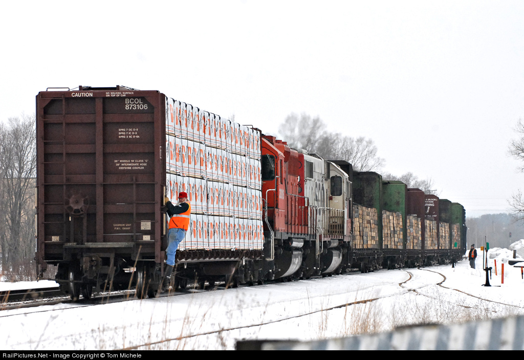 A conductor rides the end of a centerload flat with bundled lumber, pushed by CP locos 3018 and 4409 (in Soo paint) on a CP siding in Sparta, Wis. on this overcast afternoon. Eight centerloads with large wood beams is in tow and were left on the siding as the locos and bundeled lumber were taken to and spotted on a siding to Brittingham and Hixon Lumber Company, a major Sparta industry.
