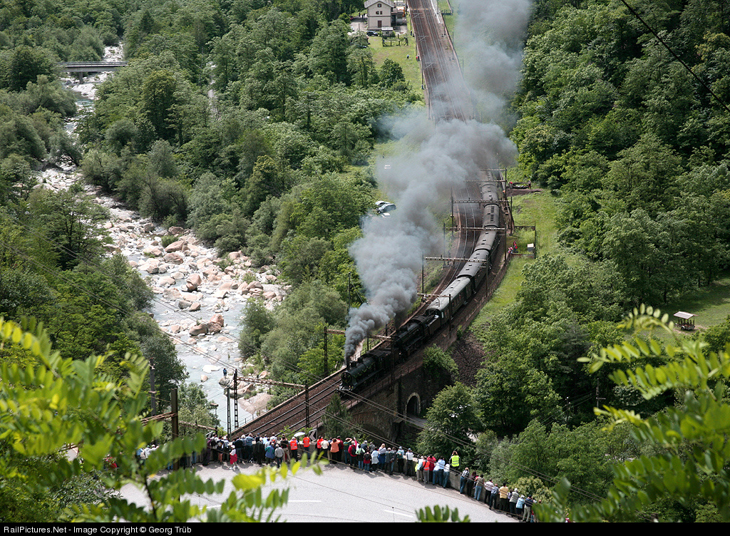 | A big croud is watching the steam train celebrating 125 years of the Gotthard line, tackling the grade through the two loop tunnels in the Biaschina, gaining about 300 feet height. The photographer is standing some meters below the upper level. |