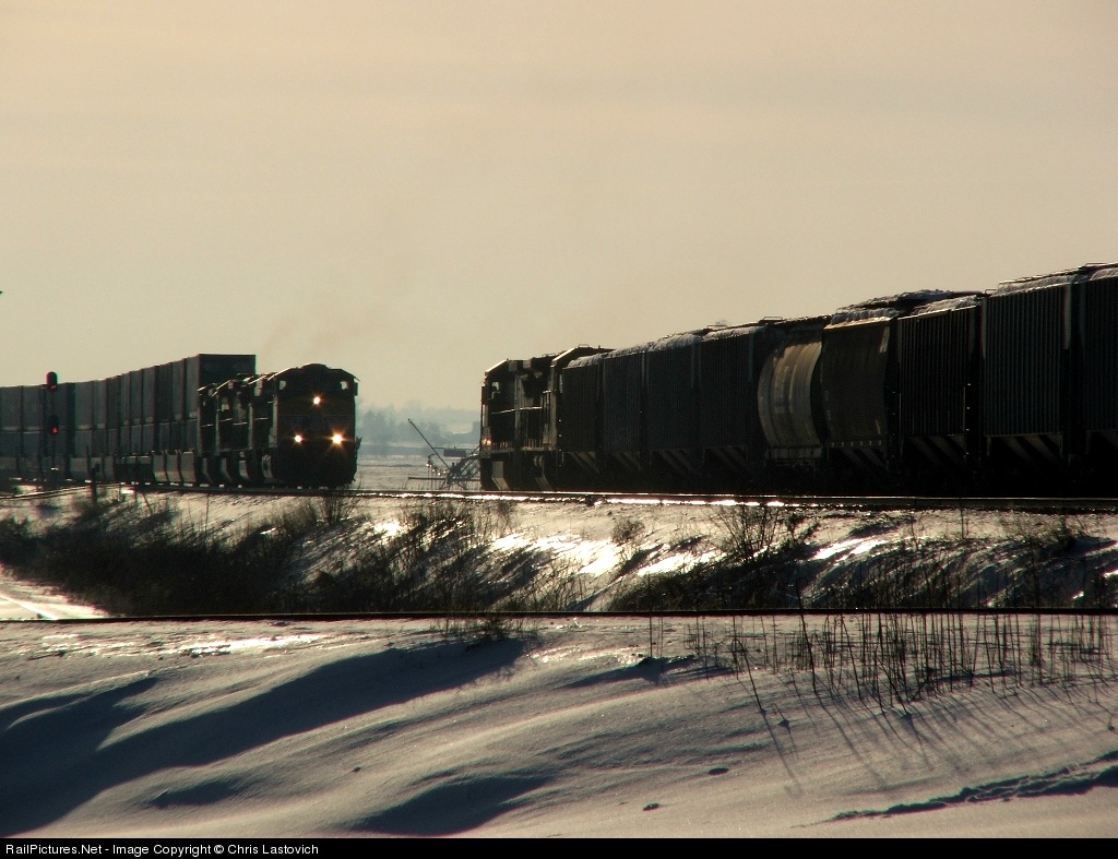 MPRPE heads west as a Gevo led stack train heads east while the sun sets over this frozen landscape.