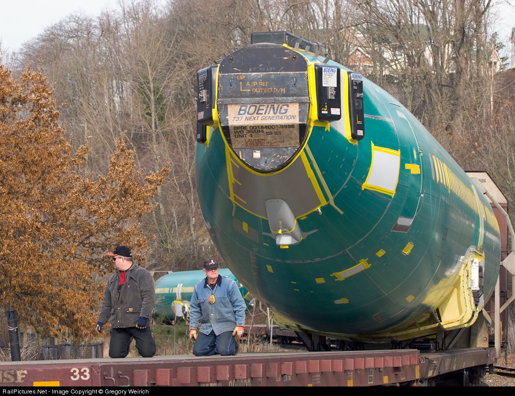 | Conductor Kerry Naff and Brakeman Randy Sanderson are riding a flatcar as they shove 4 737 fuselages toward the Renton Boeing plant. They are keeping a watchful eye for motorists crossing the Gene Coulon Parkway.