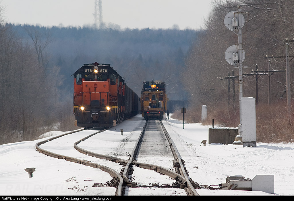 BLE 878 pulls out of the controlled siding at MD after waiting several hours for the rail grinder to come south from Albion. The Rail grinder came in off the NS at Wallace Jct and has been working south.