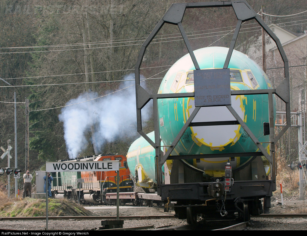 | After nearly 14 miles of 10mph running, BNSF engineer Rick Kriewald finally gets to notch out his two horses while running to the Renton Boeing plant. This was the second to the last time that the fuselages will run on this line. Progess? I don't think so. |