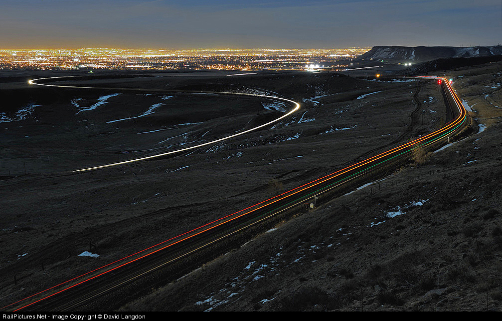 The Big Ten Curve on a full moon night with its 270 degree route lit up by the eastbound California Zephyr heading for Denver.