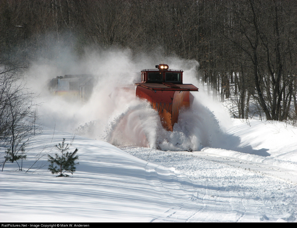 | Over the river and through the woods is this Great Lakes Central plow extra which has just crossed the Rapid River south of Mancelona on former Pennsylvania rails in northern Michigan. |