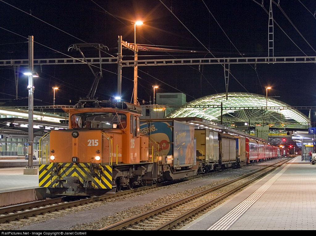 215 adds freight cars to the rear of a service to St. Moritz, this is a frequent occurrence in order to save paths on this busy narrow gauge system. The impressive roof in the background is the coach station.
