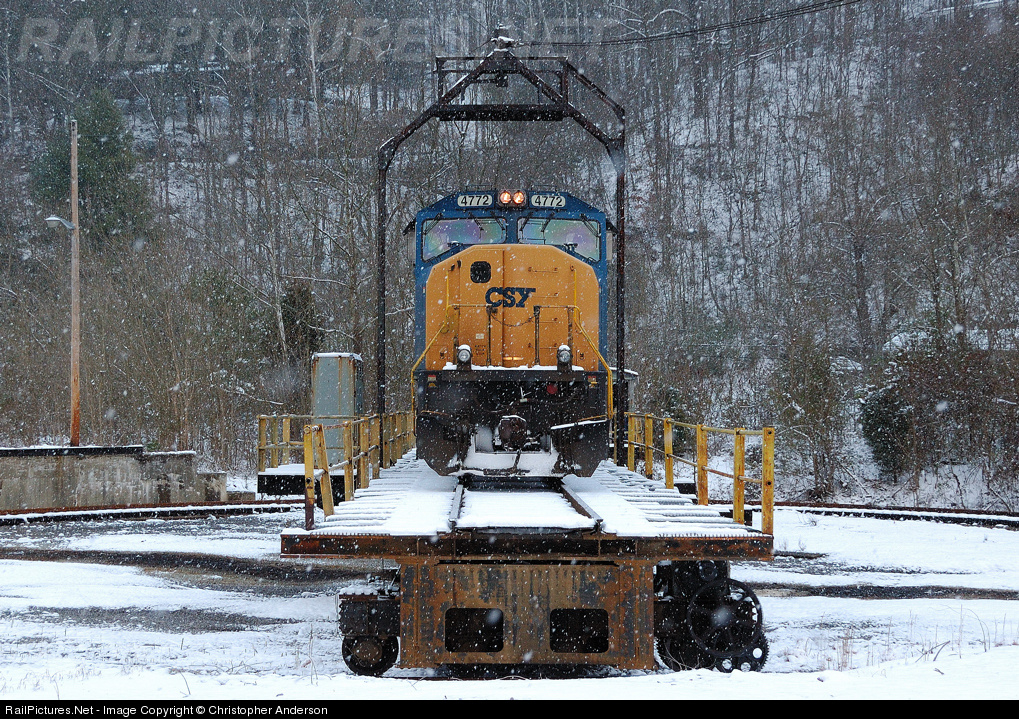 | CSX 4772 take a cold, snowy spin on the turntable in Shelby Yard. Despite the snow and ice, the turntable operated without even the slightest bit of trouble. |