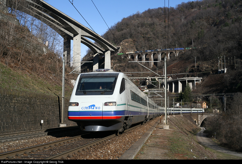 | Very friendly wave of the engineer of the Cisalpino tilt train ETR 470 005 on the way from Zürich to Milan and Florence. The train has just left the two spiral tunnels in the Biaschina, the freighttrain crossing Pianotondoviaduct on the uppermost level will follow in exactly 4 minutes and 47 seconds. |