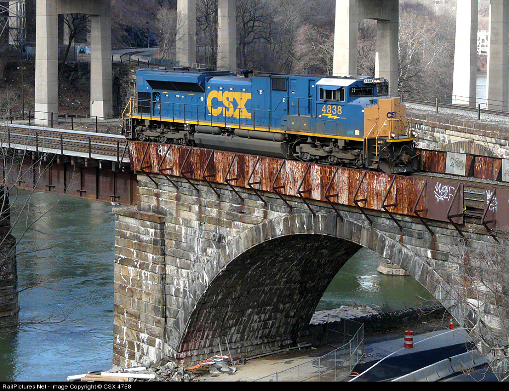 | CSX SD70ACe 4838 rolls eastbound across the Schuylkill River under the symbol Q706, a unit trash train, but with no cars. |