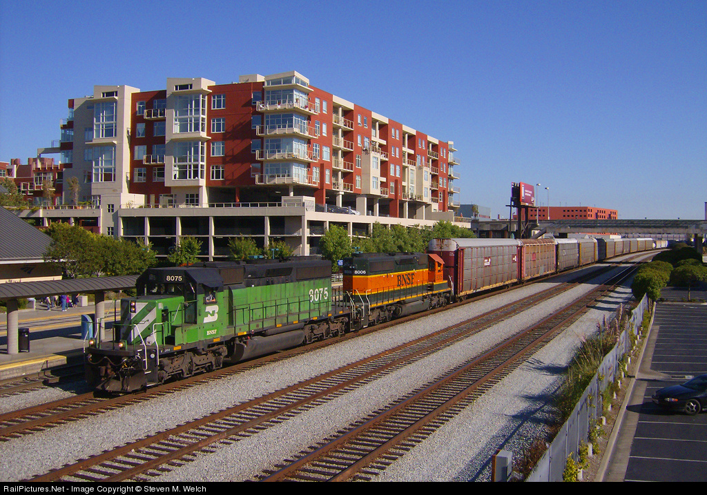 | BNSF 8075 leads a 51-car Warm Springs Local, Eastbound, through Emeryville bound for the BNSF Richmond Yard. |