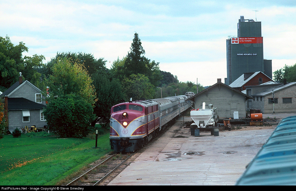 The Atlantic Coast Line E3A 501 passes the former Milwaukee Road depot, westbound in Black Earth, Wisconsin.