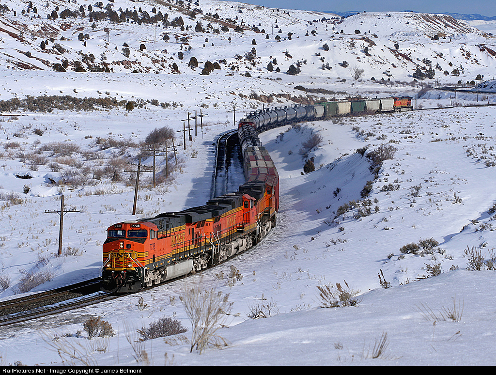 | It's time to indulge in some tasty pumpkin pie (from head to toe) on BNSF's Denver-Provo freight. A trio of GE six motor leaders and a single GE DPU have more than enough power to propel this 30 car manifest up the 1% grade west of Kyune on a sunny and snowy leap year Friday, 2008. |