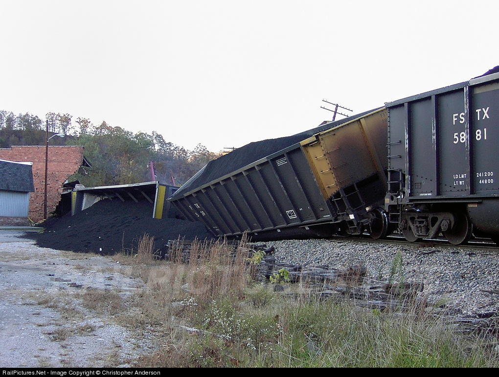 | CSX C842-22 derailed in the Lothair Section of Hazard after loading at the Bluegrass No. 4 mine. 6 of the train's cars derailed with at least 4 ending up on their side. No one was injured this building was destroyed when two of the cars went through the wall. |
