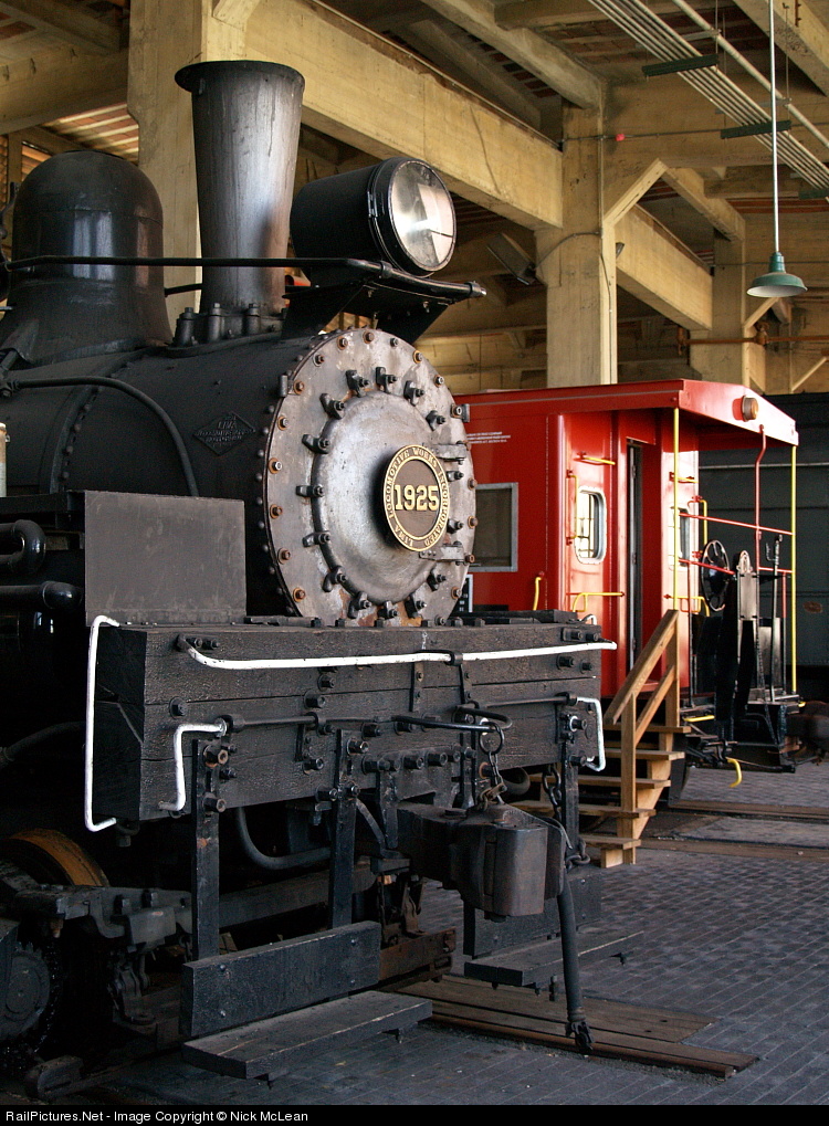 | Sitting cold inside the roundhouse awaiting its time to be returned to steam is Graham County 1925 a 70-ton model Shay built in 1925. Its trio of 12x15 inch cylinders can churn out 30,350 lbs. of tractive effort. |