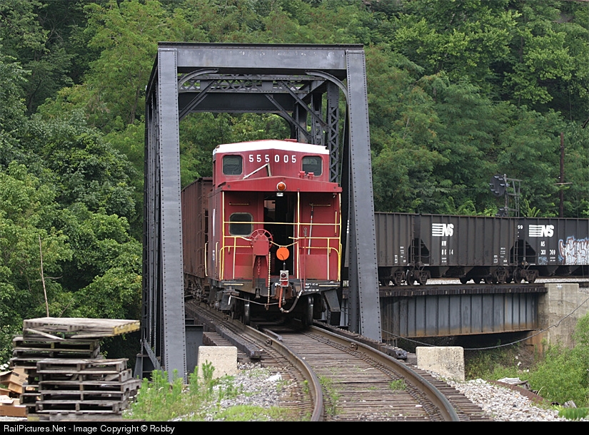 | U15 shoves mty hoppers across the Tug Fork and into Kentucky. The train will back all the way up the Delorme Branch to the big Sunnyridge mine at Coleman, KY. |