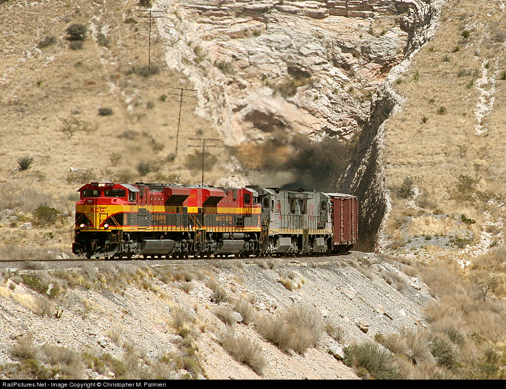 KCSM 4070, 4097, 3436, and 3351 blast out of a spectacular tunnel on the KCSM as they approach Benjamin Mendez, Coahuila, Mexico. To view this album, paste http://railbaron.rrpicturearchives.net/archivethumbs.aspx?id=31023 to your browser.