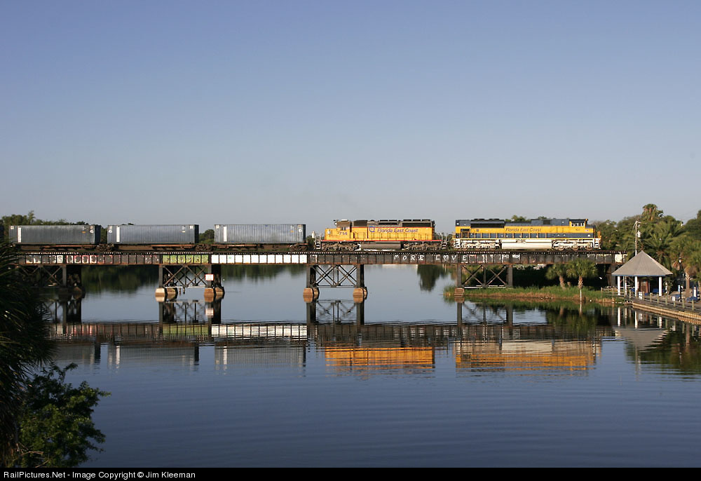 NB #206 with intermodal and empty autoracks crosses Crane Creek in Melbourne. An SD70M-2 and an SD40-2 are now a common consist on the FEC. Minutes ago the crew swapped their southbound train #109 for this consist and are heading back to Jacksonville.