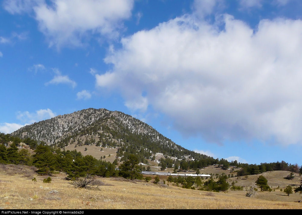 | Westbound Amtrak number 5, the California Zephyr, chugs out of Tunnel 1, with Coal Creek Peak dominating the scene. |