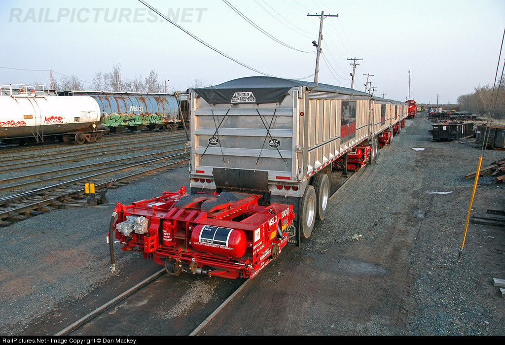 A view of the rear of the Railmate train shows how the one axle bogie interlocks into the frame of the dump trailers.