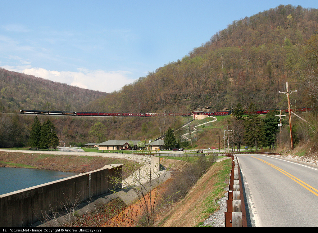 | With 4 locomotives and 15 cars the Kentucky Derby Train grinds uphill around Horseshoe Curve. The train was together at 7:45AM but problems caused its departure to be delayed until just before 10AM. |