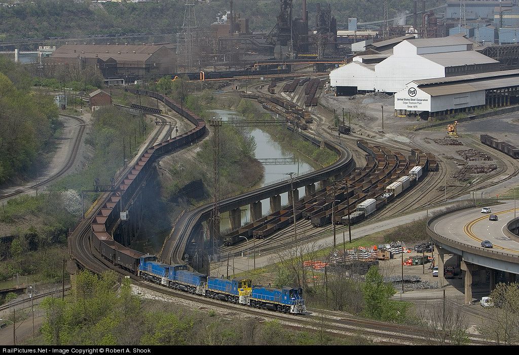 URR 22 and three others haul an empty ore hopper train north towards the BLE interchange. The great USX ET works looms in the backgroumd of this pic.