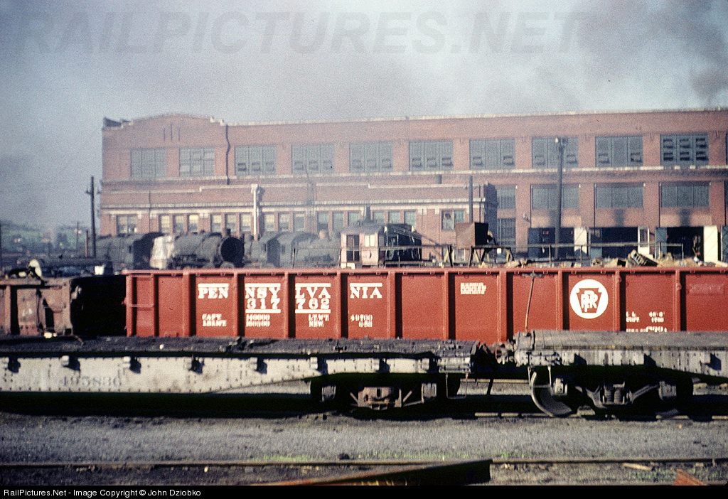 | PRR gon #317762 is fresh out of the PRR shops, a date stamp on the car reveals 6/53, the month this photo was taken. Though Altoona Works was a smokey place, the smoke in this pic is probably from the 0-6-0 #436> pulling away after setting the car out. PRR Class B8a. |