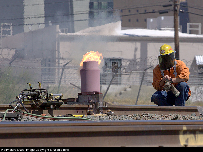 This MOW employee is employing "thermite" welding. The temperature is around 5000 degrees Fahrenheit.