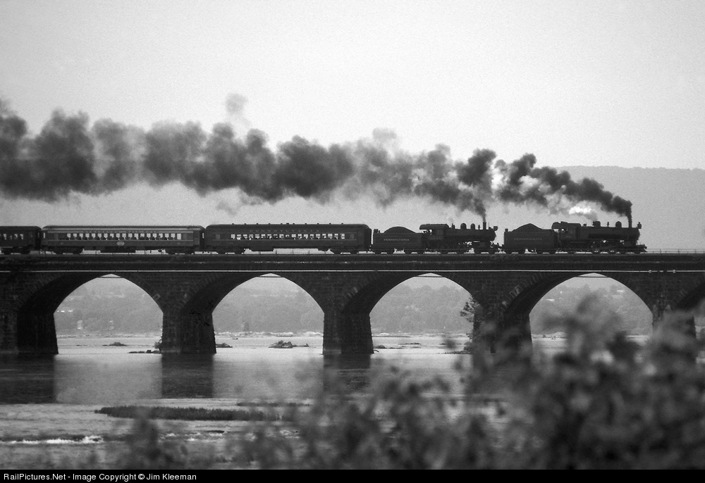 The Strasburg Railroad ran an excursion with two of it's x-PRR steam locos in June of 1985. Here the train is crossing the Rockville Bridge