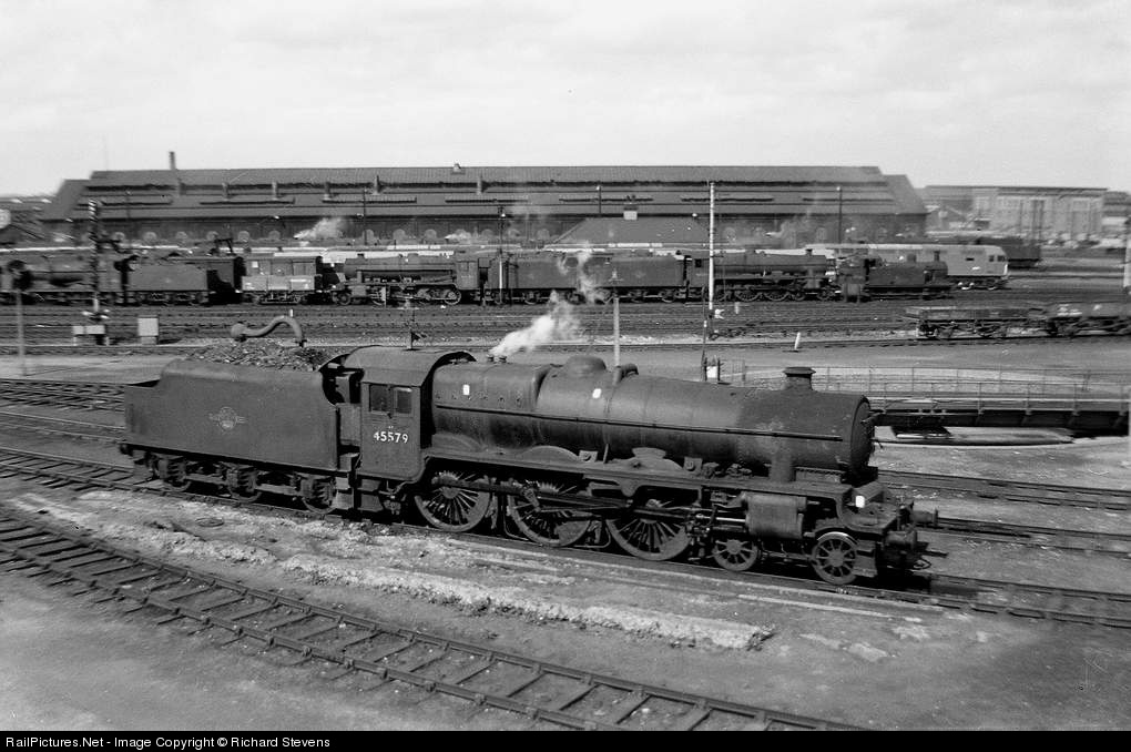 Jubilee class 45579 ‘Punjab’ stands on the site of the former North Staffordshire Railway shed in Derby, with the still very active ex-Midland Railway double roundhouse behind. The front row of locos on the depot is the scrap line, and behind that are a mixture of active steam locos and newly built diesels, both from Derby Loco Works (partially visible behind the shed) and from Brush Engineering at Loughborough. This was my first photograph of a steam loco, and is the only one in my collection that I cannot date exactly, though the presence of the first prototype blue Brush Type 4, D1733, puts it in April or May 1964. Taken with my very sophisticated first camera, a Kodak Brownie 127!