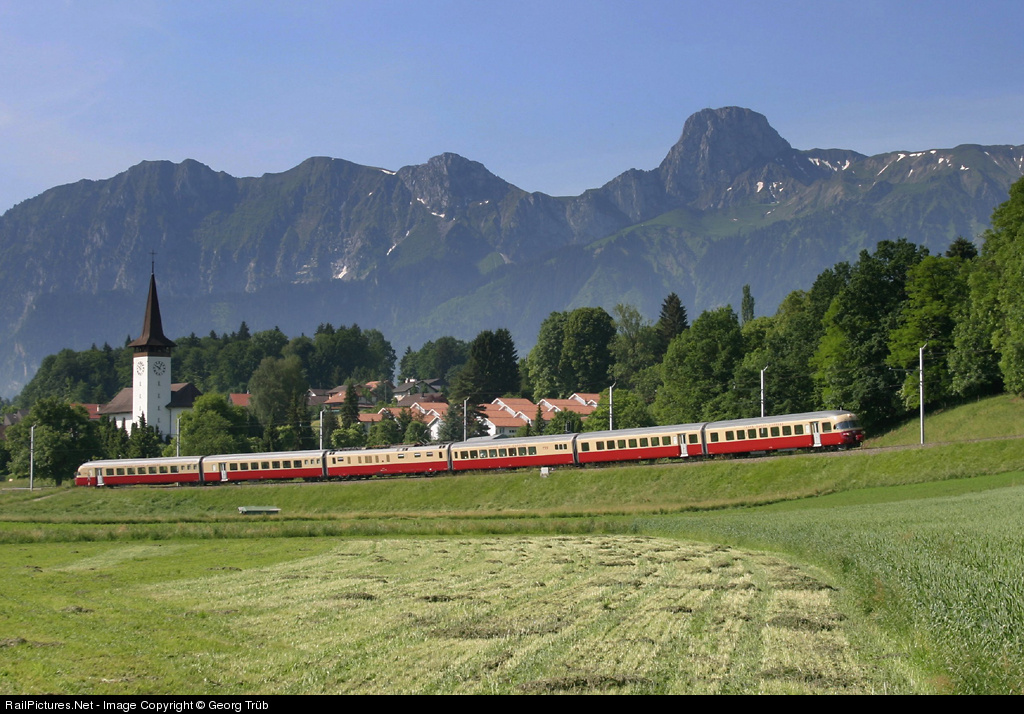 On this day the RAe TEE II trainset number 1053 was presented to the media after refurbishment in the Bönigen works of the BLS. The former RABe EC "Graue Maus" (grey mouse), wearing again the red/cream colors like in the days of the TRANS EUROP EXPRESS, is tackling the 1.5 % grade from Uetendorf to Seftigen on the line Thun-Belp-Bern, in the background the Stockhorn (2190 m).