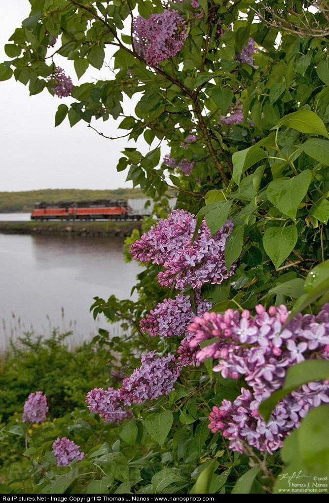| Lilacs and locomotives. P&W train NR-2 rolls in the background, blending diesel exhaust with new lilac blooms. Canon EOS 20D, Sigma 18-50mm f/2.8 EX DC |