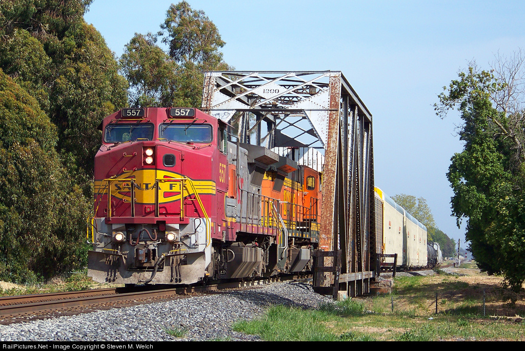 | BNSF 557 North leads the Warm Springs Local over a small creek that takes run-off water from Castro Valley, and parts of Hayward down to the San Francisco Bay on a nice Spring afternoon. |