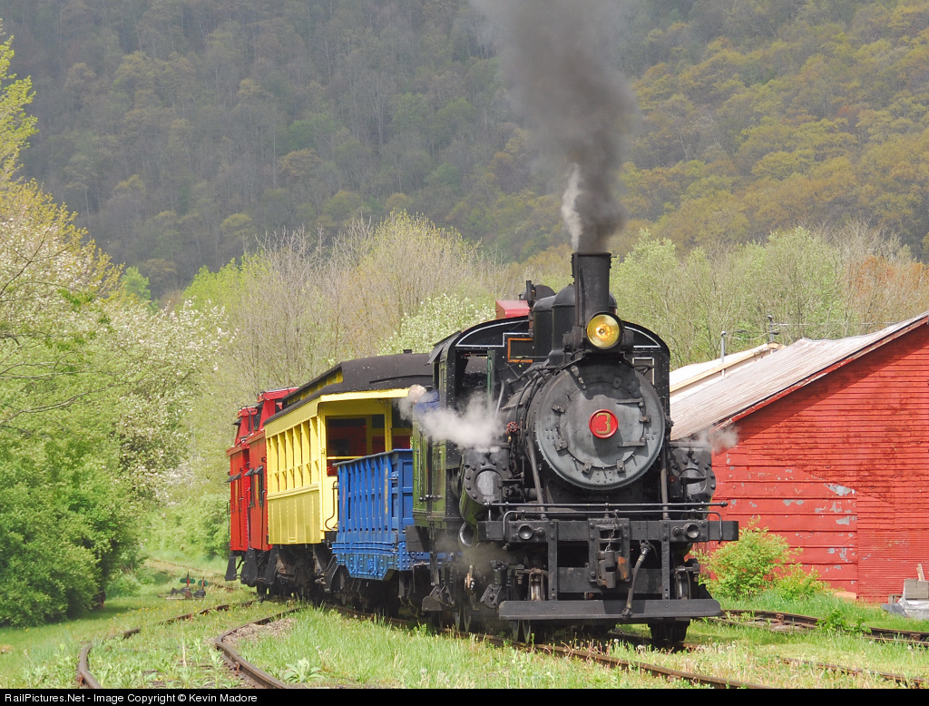 | The pride of the Durbin and Greenbrier Valley Railroad, the Durbin Rocket departs the yard for an excursion along the West Virginia's Greenbrier River. The power is none other than Moore-Keppel Climax #3, one of just 3 operable Climax engines in the US. |