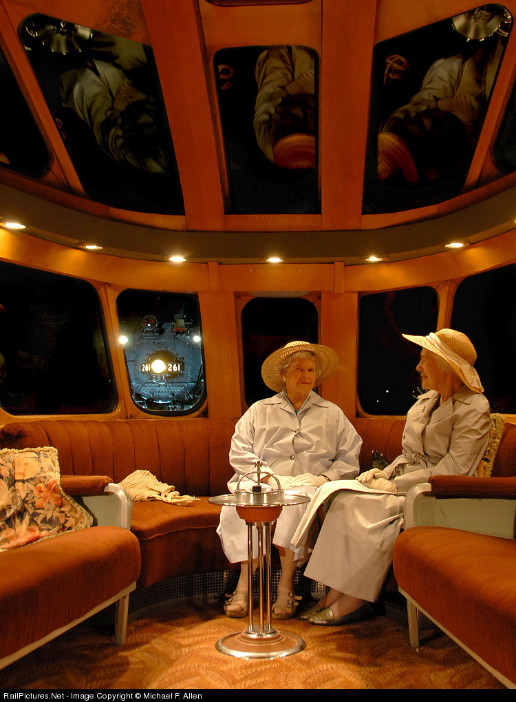 | Two ladies chat in the lounge section of the sky top observation, Cedar Rapids, while the crew oil around on 261 in the background. Thanks to Pete Lerro for arranging this charter and to Nils Huxtable for bringing his mom and her friend to model the golden era of rail travel! |