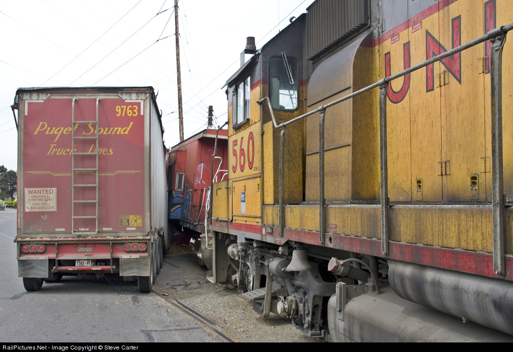 | A Fife based UP local ends up T-Boning a Wood chip trailer with their caboose, after the driver's ill advised right turn. Train 1, Truck 0. New job in future for the truck driver. Click Here to view the other end of this collision. |