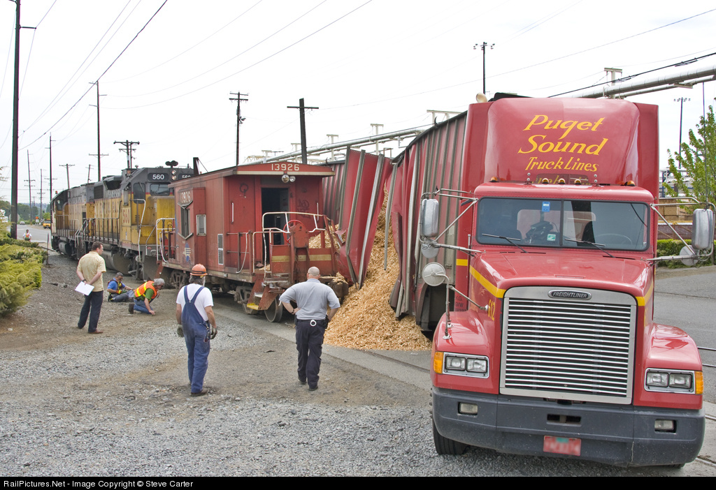 This Fife based UP local ends up T-Boning a Wood chip trailer with their caboose, after the driver's ill advised right turn. A crowd of officials, police officers and bystanders watch as the Conductor (sitting) gently eases the caboose off the truck and to a perfect re-railing. Geez, crews have to go to a lot of trouble to get air freshener for these old cabooses. Click Here for a view of the caboose, after being re-railed.