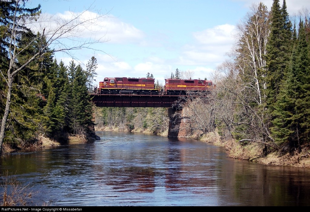 Once a staple of the Iron Range, only a handful of maroon Missabe units remain. Here is a matched pair pulling loads across the bridge bound for the Fairlane Taconite plant.