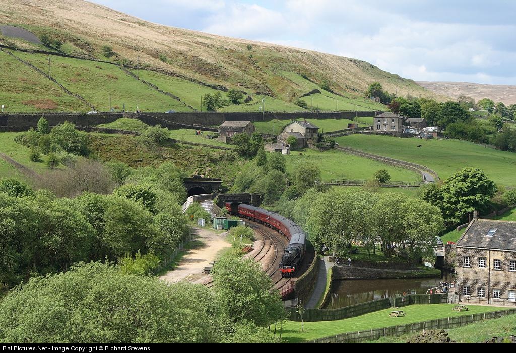 The 'Cotton Mill Express' rolls out of the double-track Standedge Tunnel. Opened in 1894, this is the most modern of four tunnels under the Pennine Hills at this point. The first tunnel, opened in 1809, was for the Huddersfield narrow canal, and the approach to this can be seen turning sharp left from the canal basin in the foreground. The other two tunnels were single track railway tunnels, hidden in the trees to the left of the double track tunnel. All the tunnels are over three miles long.