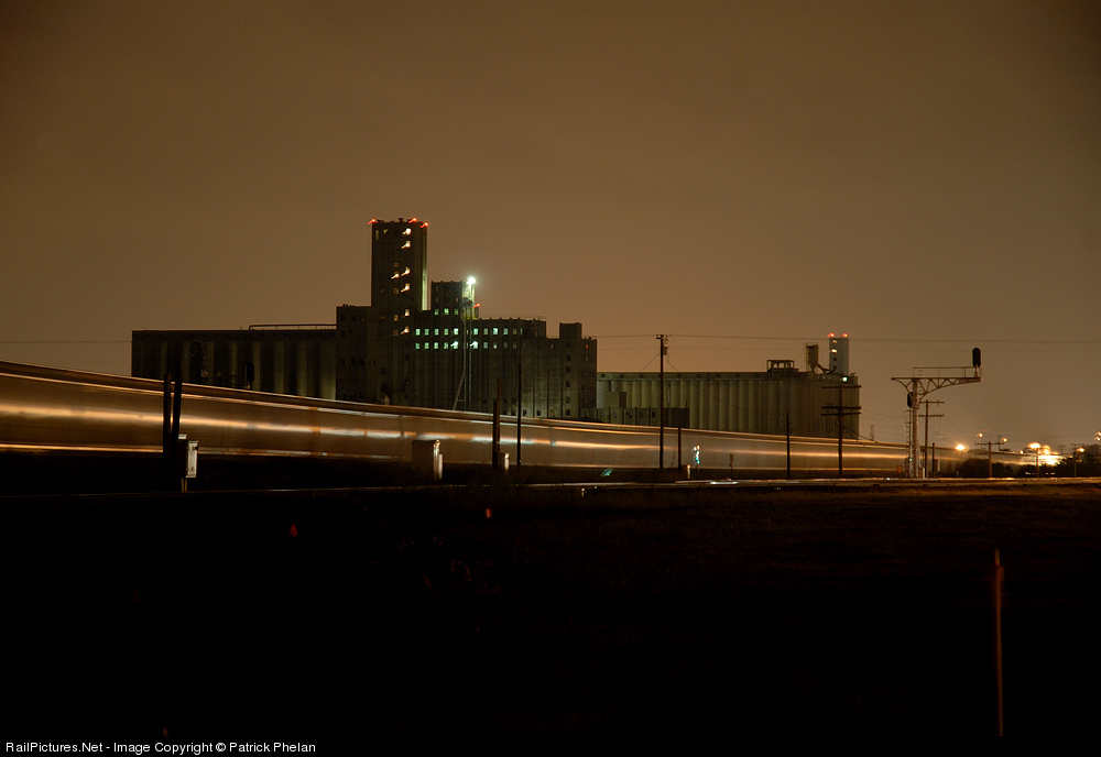A loaded UP grain train heads through Saginaw with a large mill seen in the background. The signals on the right are on the former Santa Fe.
